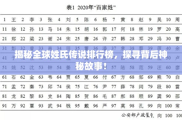 在全球多元文化的背景下,姓氏文化是一种独特的文化现象,每个姓氏背后都隐藏着丰富的历史、传说和文化内涵,本文将从全球视野出发,探讨世界姓氏传说的排名及其背后的文化意蕴。