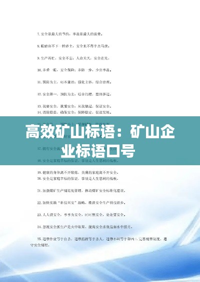 高效矿山标语不仅能够激发员工的工作热情,还能提高矿山工作效率,确保矿山工作的安全、环保。通过这些标语,我们希望矿山员工能够时刻保持高效、安全、环保的工作态度,为我国矿山事业的发展贡献力量。