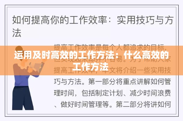 运用及时高效的工作方法是一个持续改进的过程。通过不断学习和实践,我们可以不断提高工作效率,实现个人和组织的卓越。记住,高效工作不仅仅是一种技能,更是一种生活方式。让我们一起努力,成为更高效的工作者。