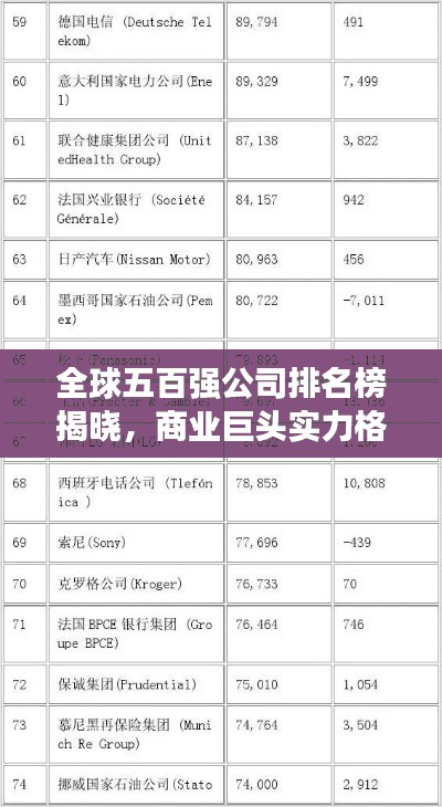 五百强公司排名榜是由权威机构根据企业的营业收入、净利润、资产规模等多项指标进行综合评价后得出的全球企业排名,这份榜单涵盖了全球各行各业的企业巨头,是反映全球经济运行状况的重要窗口,随着全球经济的不断发展,五百强公司排名榜的影响力逐渐扩大,成为衡量企业实力和竞争力的重要指标之一。