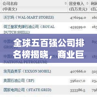 随着全球经济的发展,五百强公司排名榜已经成为衡量企业实力和影响力的权威指标,这份榜单不仅反映了全球商业巨头的实力格局,也揭示了全球经济的未来趋势,本文将详细介绍五百强公司排名榜的背景、内容、影响因素以及上榜公司的特点,带领读者了解全球商业巨头的风采。