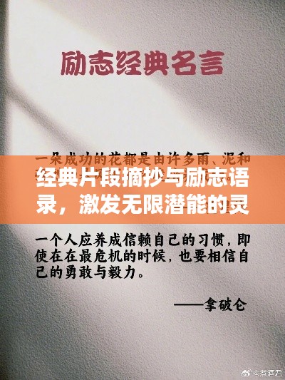 人生旅程中,我们时常需要一些励志的话语来鼓舞自己,激发前行的动力,经典片段中的励志语录,犹如智慧的火花,点亮我们心中的希望,本文将从众多经典中挑选出鼓舞人心的片段,并对其进行摘抄与解读。