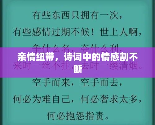 亲情是我们生命中永恒的主题之一,它如同一束光,照亮我们前行的道路;如同一股力量,支撑我们面对生活的挑战与困境,那些深藏在诗词中的情感纽带,让我们时刻感受到亲情的温暖与关怀,让我们珍惜这份宝贵的财富,用心去感受亲情的美好与伟大,因为亲情割不断,我们的心灵永远相连。