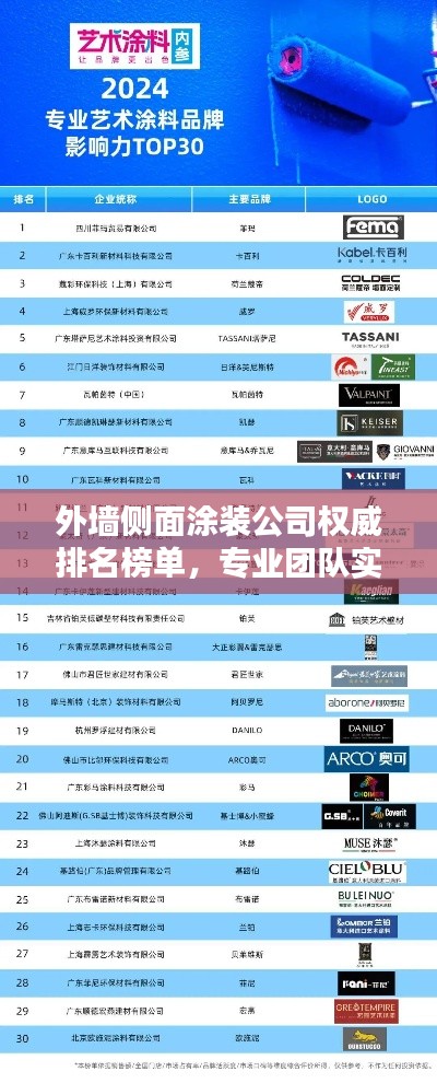 外墙侧面涂装公司排名是根据公司的技术实力、服务质量、项目经验和客户口碑等多个因素进行综合评价的,本文介绍了一些在行业内颇具影响力的公司,如XX公司、YY公司和ZZ公司等,这些公司在外墙侧面涂装领域拥有一定的优势和特色,能够为客户提供优质的服务,排名并非绝对,不同的评价标准和市场需求可能会导致不同的排名结果,在选择外墙侧面涂装公司时,客户应根据自身需求和实际情况进行综合评估,选择最适合自己的合作伙伴。