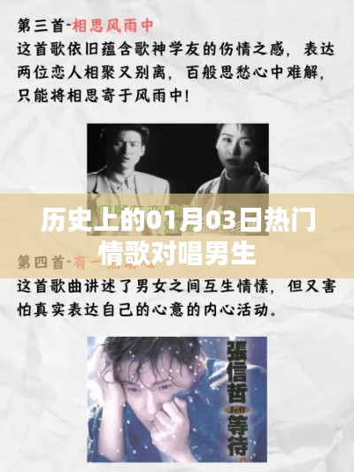早在流行音乐的黄金时代,就有许多经典情歌对唱作品诞生于01月03日前后,如《心雨》和《你是我心内的一首歌》,这些歌曲以其优美的旋律和深情的歌词,成为了许多恋人之间的甜蜜回忆,这些歌曲通常由两位男歌手共同演绎,展现了男生之间的深厚友情和对爱情的独特见解。
