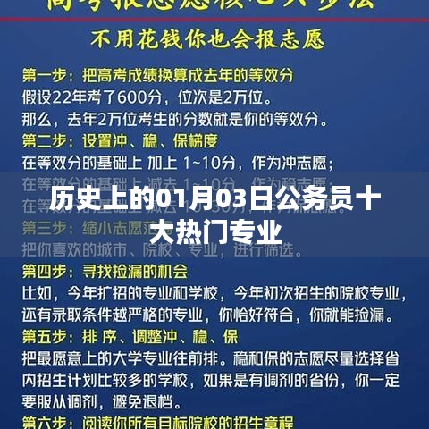 是历史上的01月03日公务员十大热门专业,这些专业在公务员考试中具有很大的竞争力,但并不是只有这些专业的考生才能报考公务员,只要符合相关要求,任何专业的考生都可以参加公务员考试,随着社会的不断发展和变化,热门专业也会有所变化,考生在选择专业时,不仅要考虑自己的兴趣和优势,还要考虑未来的就业前景和发展趋势,希望本文能为广大考生提供参考,祝愿大家都能顺利考取自己心仪的公务员职位。